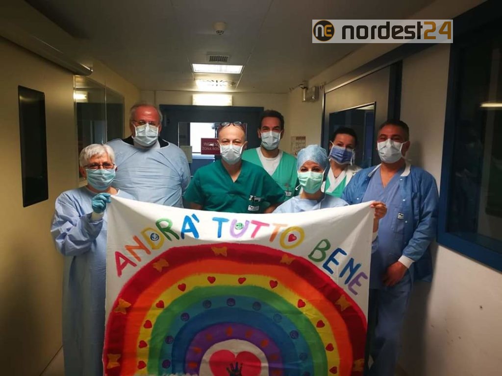 GORIZIA. Inaspettato omaggio questa mattina, giovedì 26 marzo 2020, nel reparto Covid-19 a Gorizia dove una bimba di 3 anni, grazie all'aiuto della mamma, ha consegnato a medici ed infermieri un maxi arcobaleno colorato rassicurando tutti con la scritta: " andrà tutto bene".