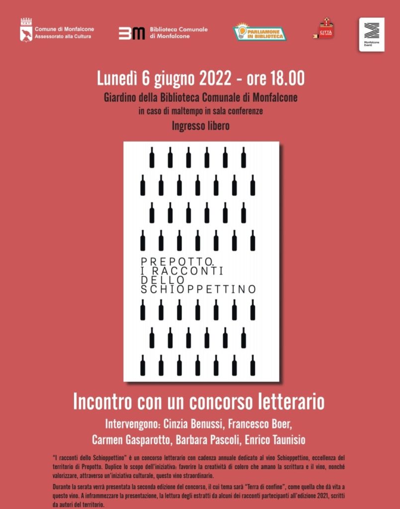 Lunedì 6 giugno 2022 alle 18.00, nel Giardino della Biblioteca Comunale di Monfalcone, Cinzia Benussi, Francesco Boer, Carmen Gasparotto, Barbara Pascoli e Enrico Taunisio saranno ospiti dell’intervento dedicato a “I racconti dello Schioppettino”.