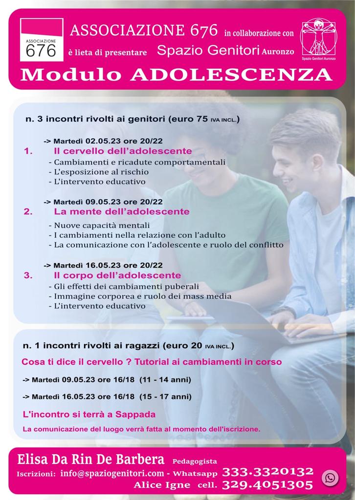 Tre incontri rivolti ai genitori sul tema dell’adolescenza, organizzati dall’associazione culturale 676 di Sappada, sono in programma nella località montana il 2, 9 e 15 maggio alle ore 20. I titoli degli incontri curati dalla pedagogista Elisa Da Rio De Barbera, della durata di 2 ore e che vedono la collaborazione dell’associazione Spazio Genitori Auronzo, sono “Il cervello dell’adolescente”, “La mente dell’adolescente” e “Il corpo dell’adolescente”.