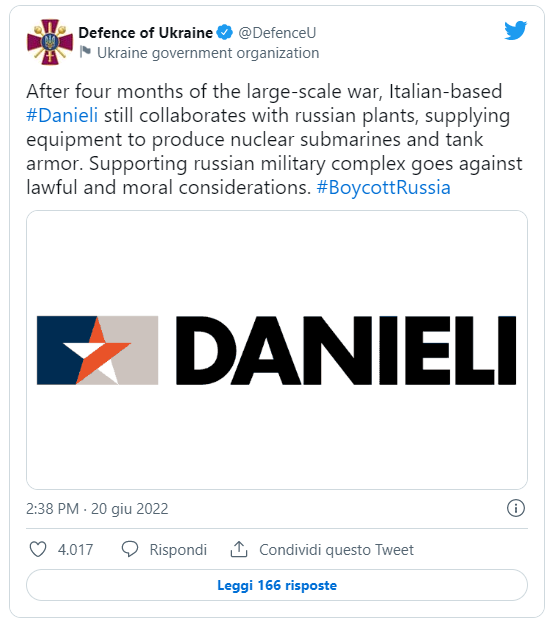 UDINE - «Dopo quattro mesi di guerra su larga scala, l'italiana Danieli collabora ancora con gli stabilimenti russi, fornendo attrezzature per la produzione di sottomarini nucleari e blindature per carri armati», ha affermato il Ministero della Difesa ucraino sul suo account Twitter ufficiale.