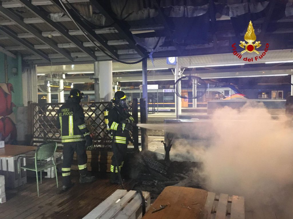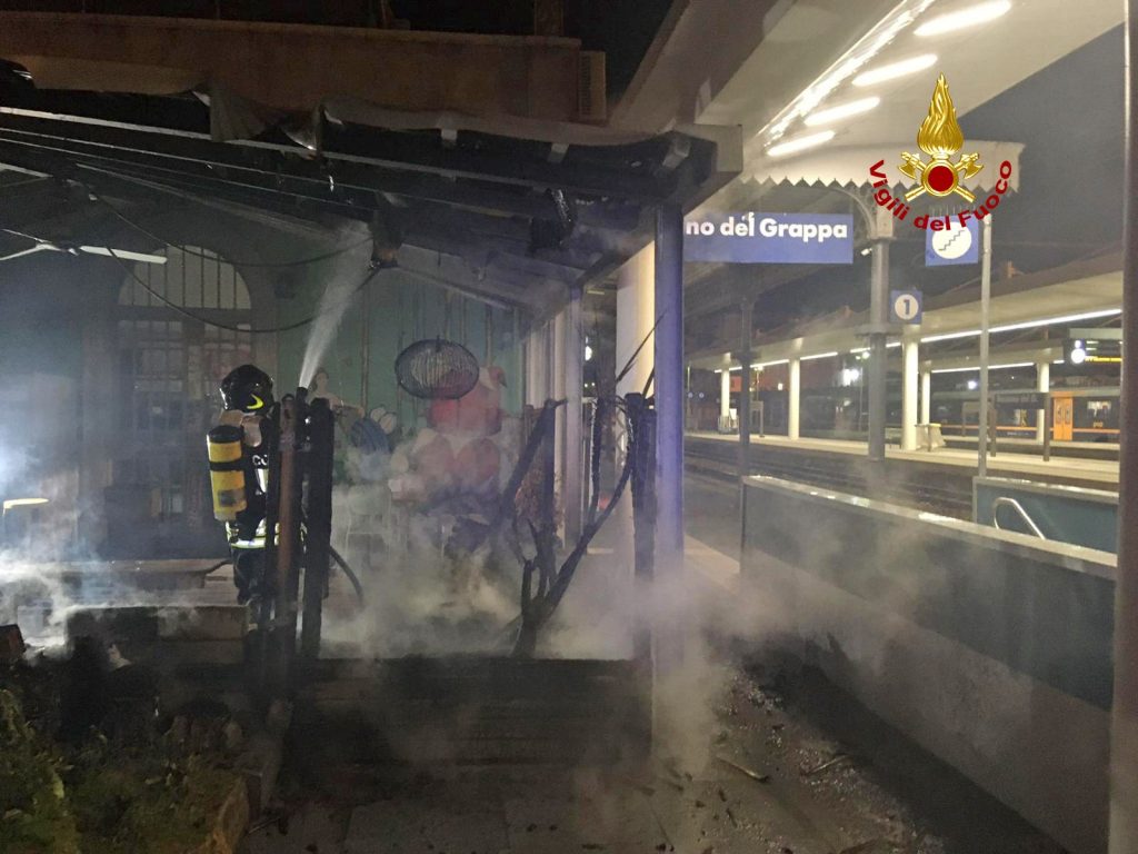 BASSANO DEL GRAPPA (VI). Nella notte di oggi 11 maggio 2022, alle 3:30, i vigili del fuoco sono intervenuti in via De Blasi presso la stazione ferroviaria di Bassano del Grappa per l'incendio del plateatico del bar posto nei giardinetti al primo binario.