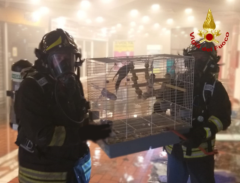 Incendio a Città Fiera: i pompieri salvano un uomo e gli animali del negozio