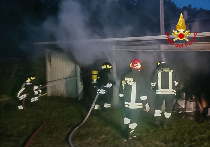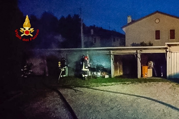 Intervento dei vigili del fuoco a Treviso per un incendio che ha distrutto quattro garage e una macchina. Non si registrano feriti. Causa dell'incendio ancora da determinare