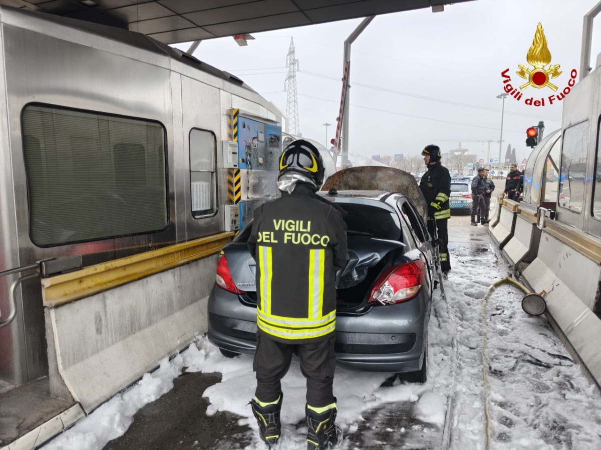 L'auto va improvvisamente a fuoco mentre salda il pedaggio in Autostrada