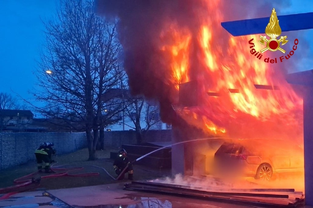 Fiamme alte dal garage: bruciano un'auto, una bici elettrica, le batterie e l'inverter del fotovoltaico