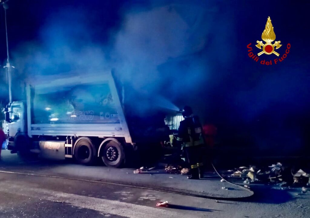 Prende fuoco il carico di rifiuti: in fiamme un camion compattatore
