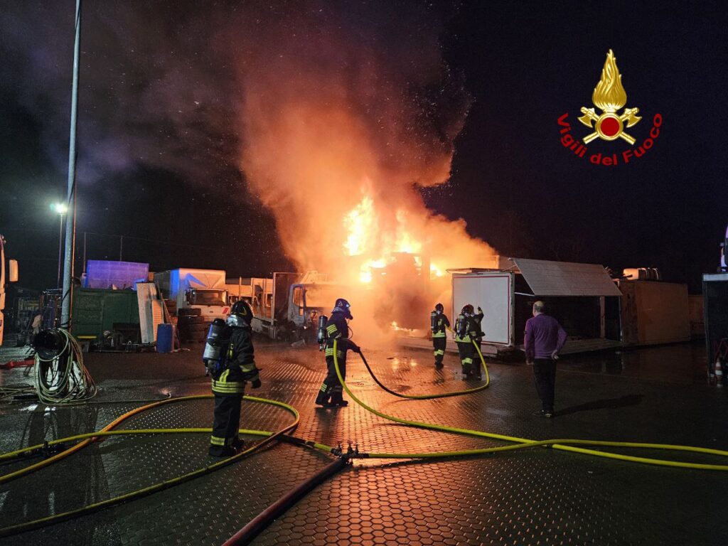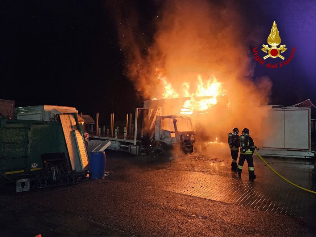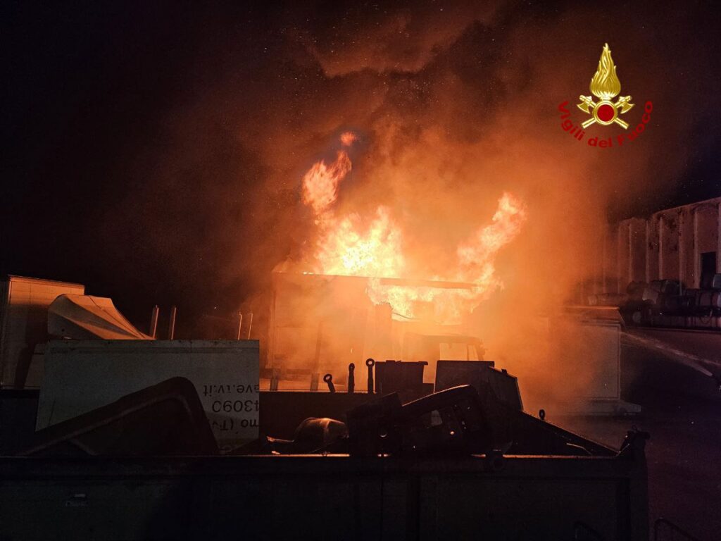 Le fiamme hanno interessato, in un parcheggio all’aperto, un camion andato bruciato, un rimorchio carico di pneumatici e altri due mezzi pesanti danneggiati parzialmente. Nessuna persona è rimasta coinvolta.