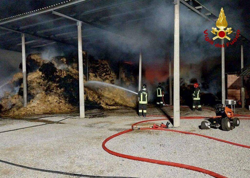 GRUARO. Nella serata di giovedì 29 agosto, alle 22:20, un grave incendio è scoppiato in un deposito di fieno situato in via Belfiore, a Gruaro (VE). Il rogo ha coinvolto circa 700 quintali di balle di fieno, creando una situazione di emergenza che ha richiesto un intervento massiccio da parte dei vigili del fuoco.