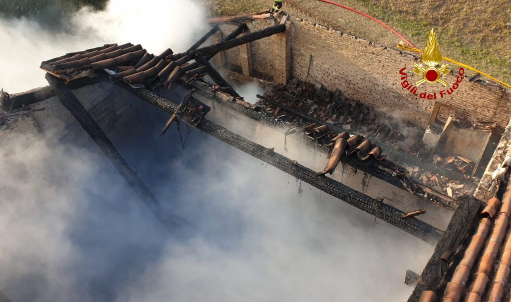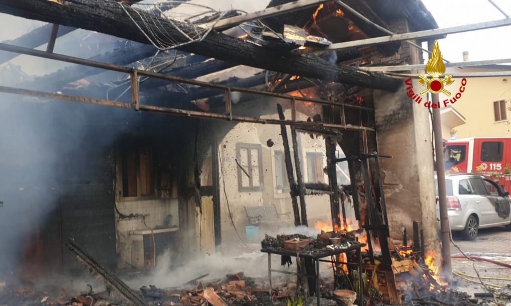 L’incendio è ora circoscritto, danneggiata gravemente la porzione di abitazione d’angolo e parte del tetto del fabbricato centrale.