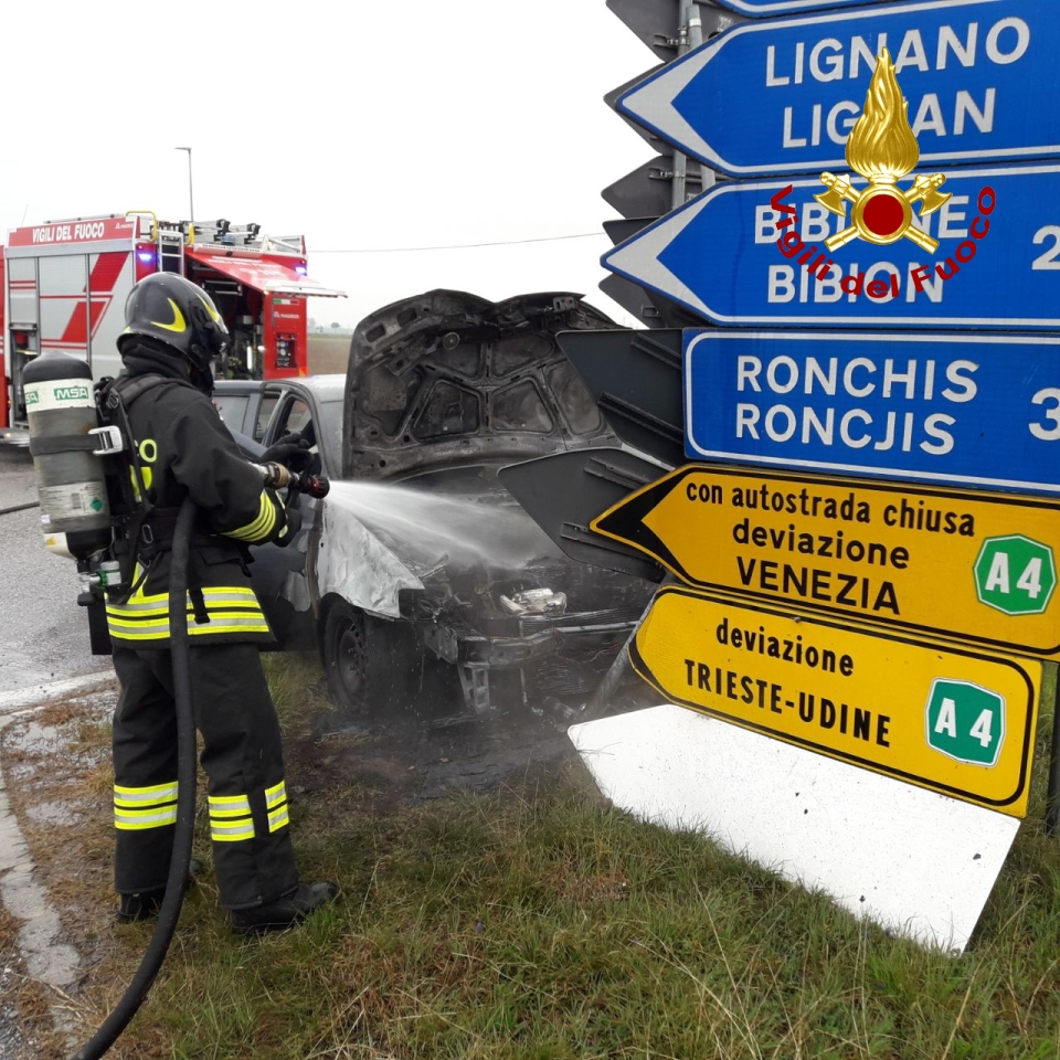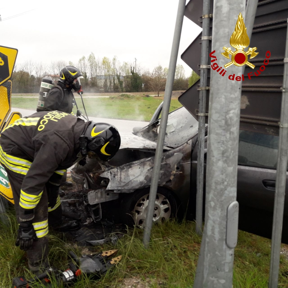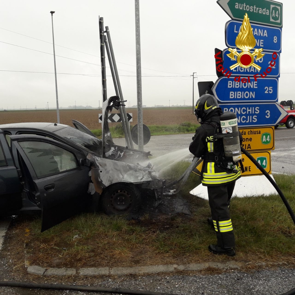 Incendio di un'auto a Ronchis (UD), autista accosta e finisce contro la segnaletica