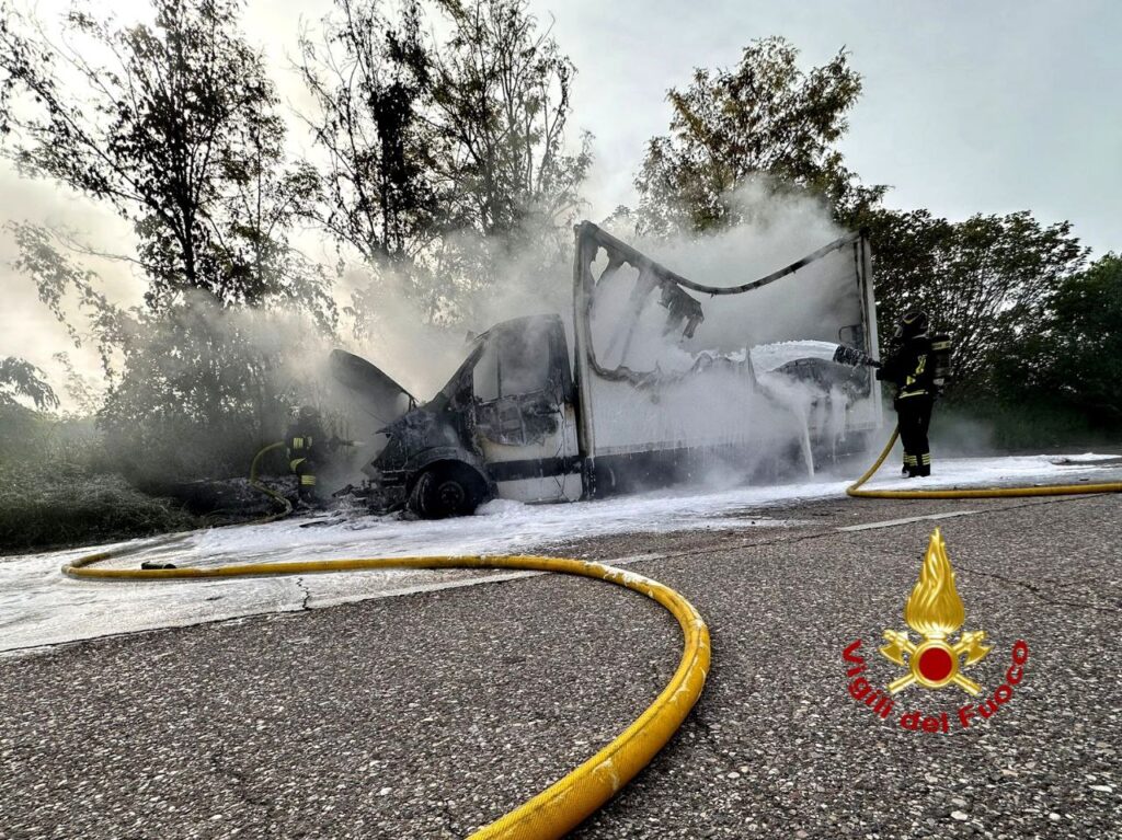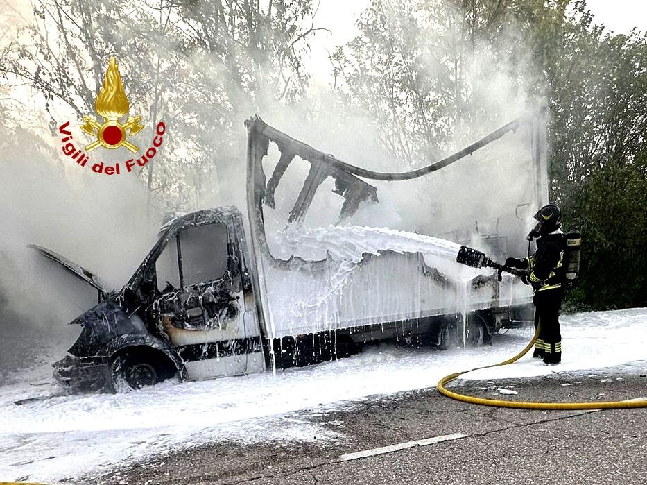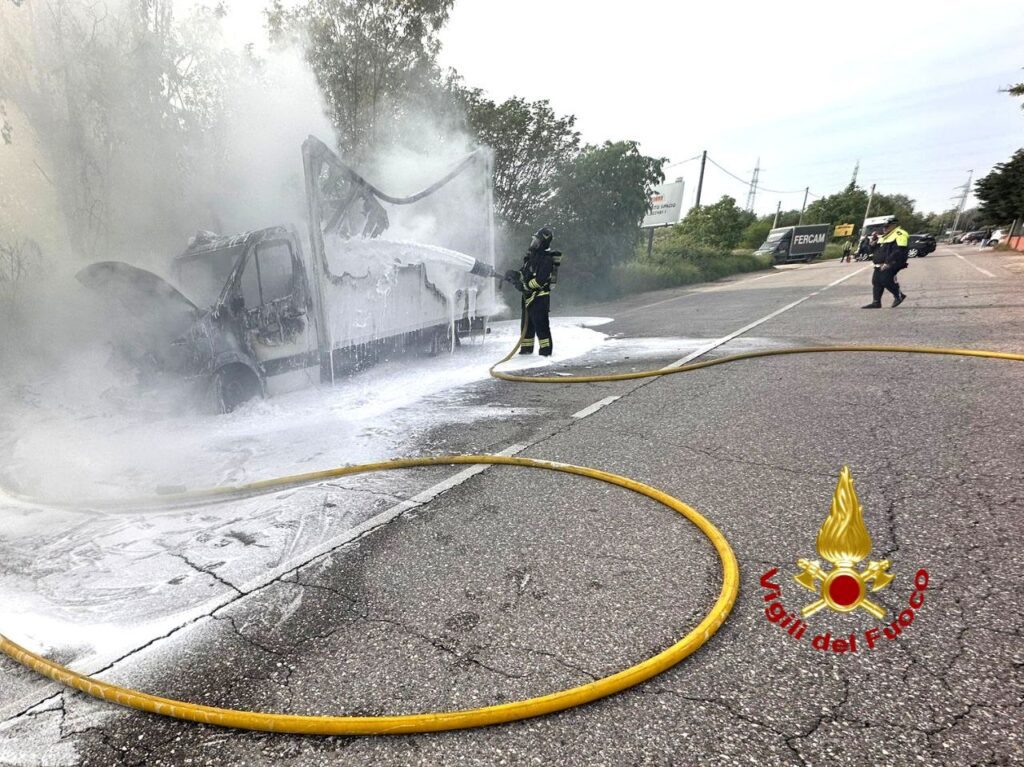 Ad andare a fuoco un furgone cassonato alimentato a metano che trasportava materiale vario tra cui carta, solventi e vernici.