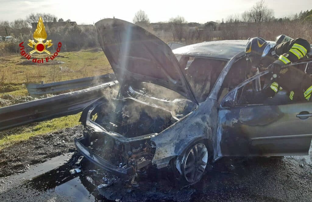 Ha accostato ed è sceso, mentre la Golf Volkswaghen ha preso fuoco.