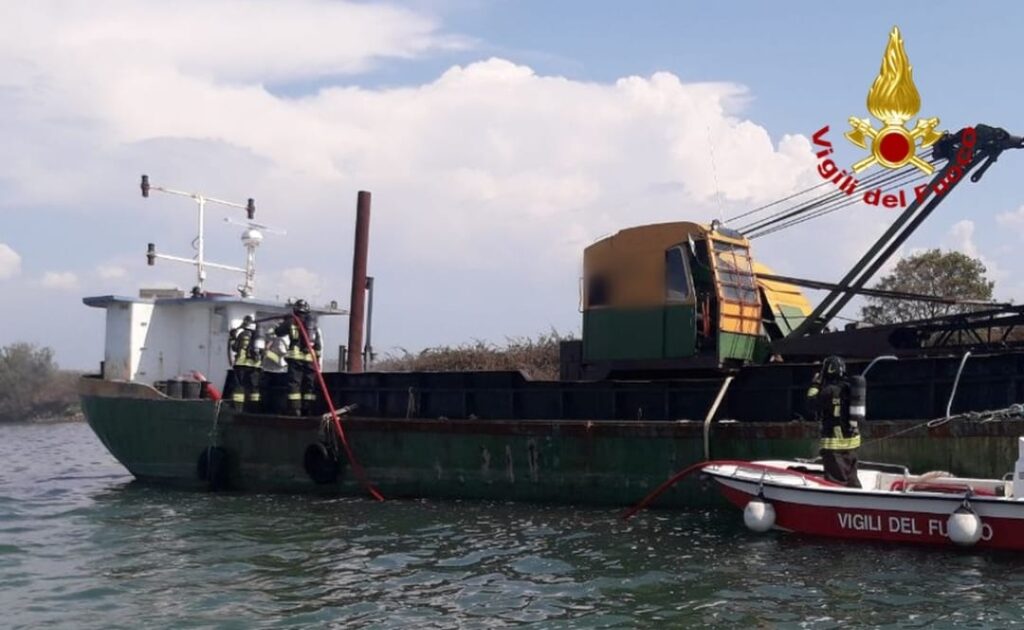 Fiamme in un'imbarcazione ad uso draga nel Canale Litoranea Veneta a Grado