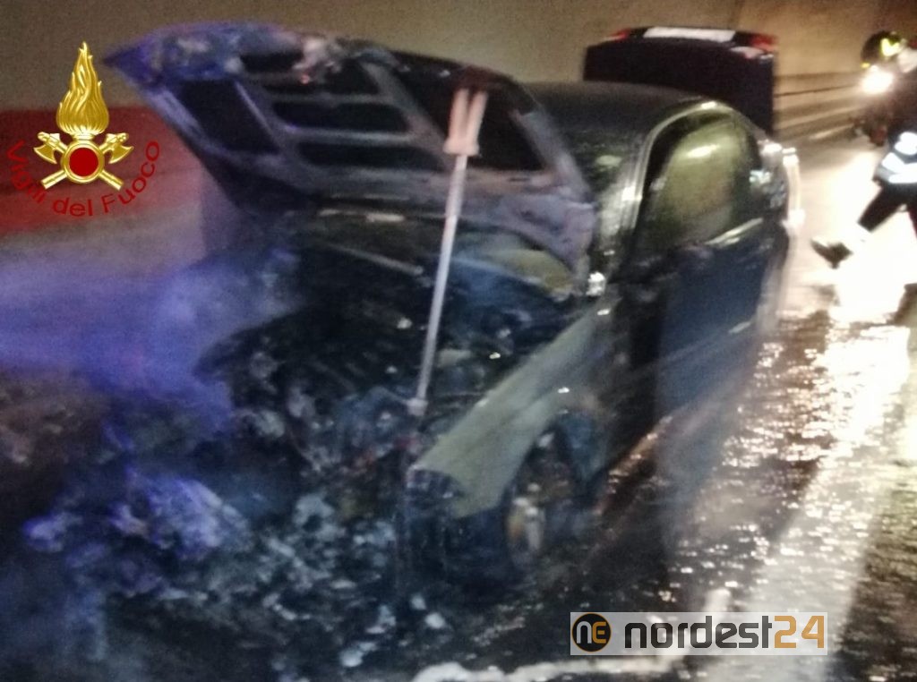 Una BMW, posizionata prontamente sulla corsia di emergenza dal conducente, stava bruciando all’interno della galleria, i VV.F. giunti sul posto hanno subito spento l’incendio con il Naspo ad alta pressione.