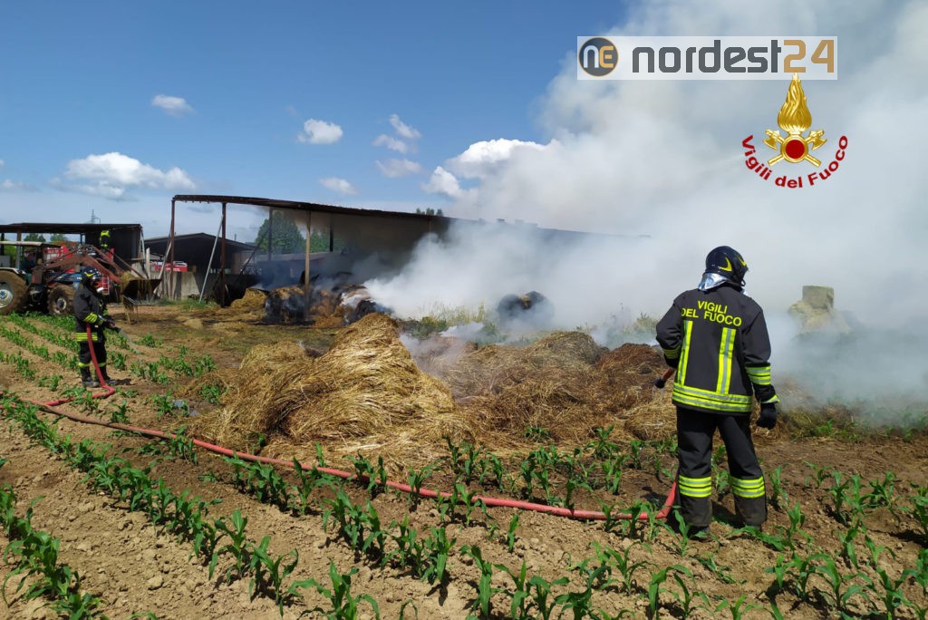 I pompieri accorsi da Lonigo e da Vicenza con due autopompe, due autobotti e quattordici operatori, sono al lavoro per lo spegnimento e la bonifica di oltre 500 rotoballe di fieno coinvolte nel rogo.