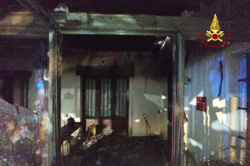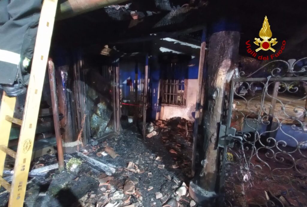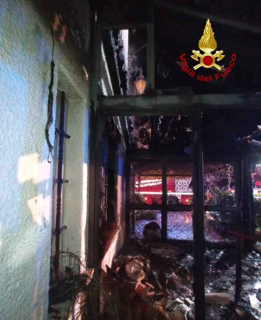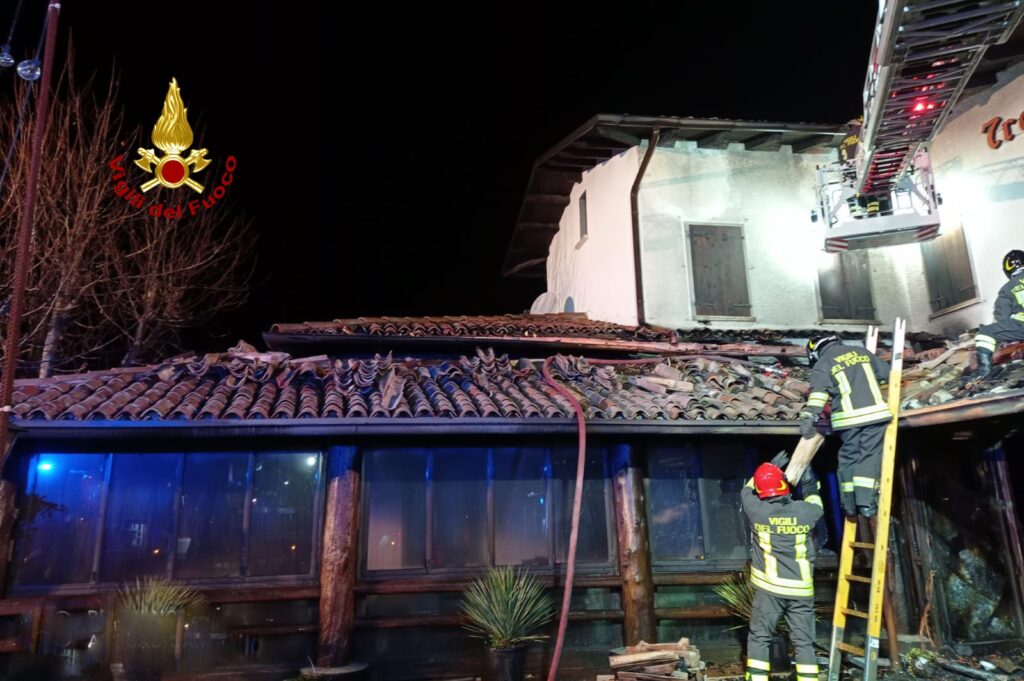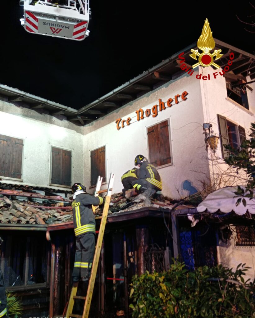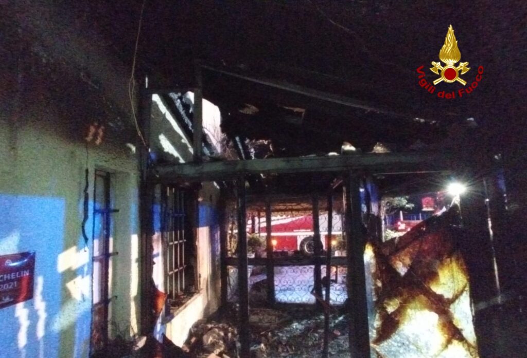 L’incendio ha interessato l’atrio esterno del ristorante, lo spiovente in legno del tetto, propagandosi anche all’interno, provocando danni da fumo all’intero stabile.
