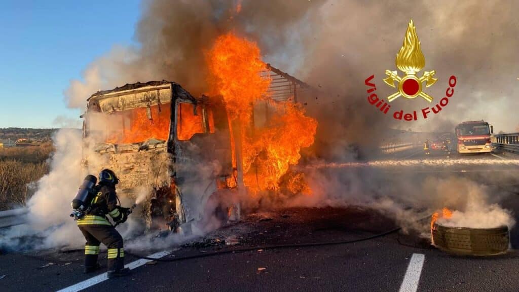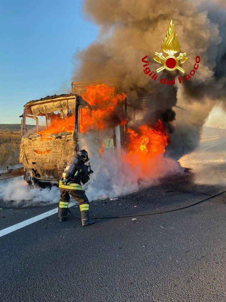 Scoppia l'incendio, autoarticolato avvolto dalle fiamme. Autista in salvo