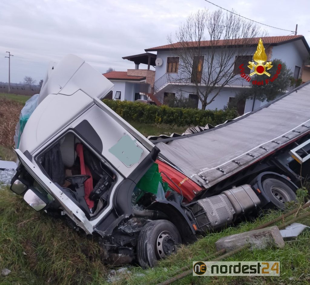 Ferito in maniera lieve l’autista del camion finito parzialmente rovesciato fuori strada.