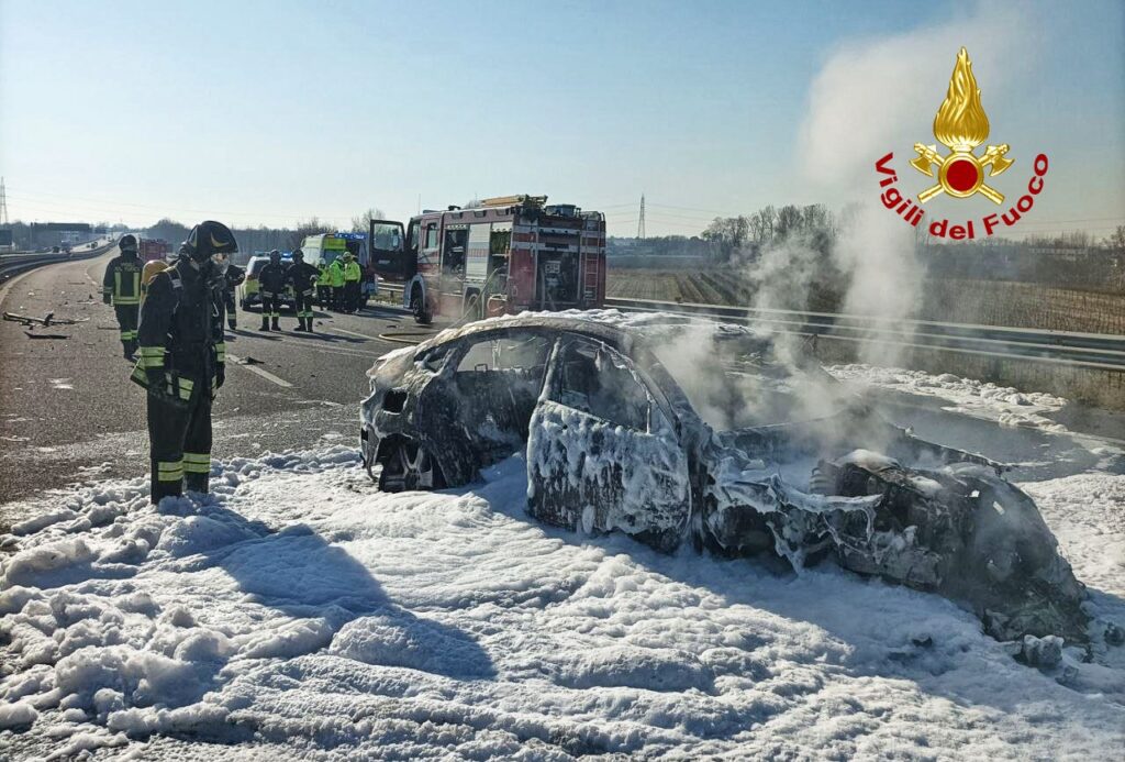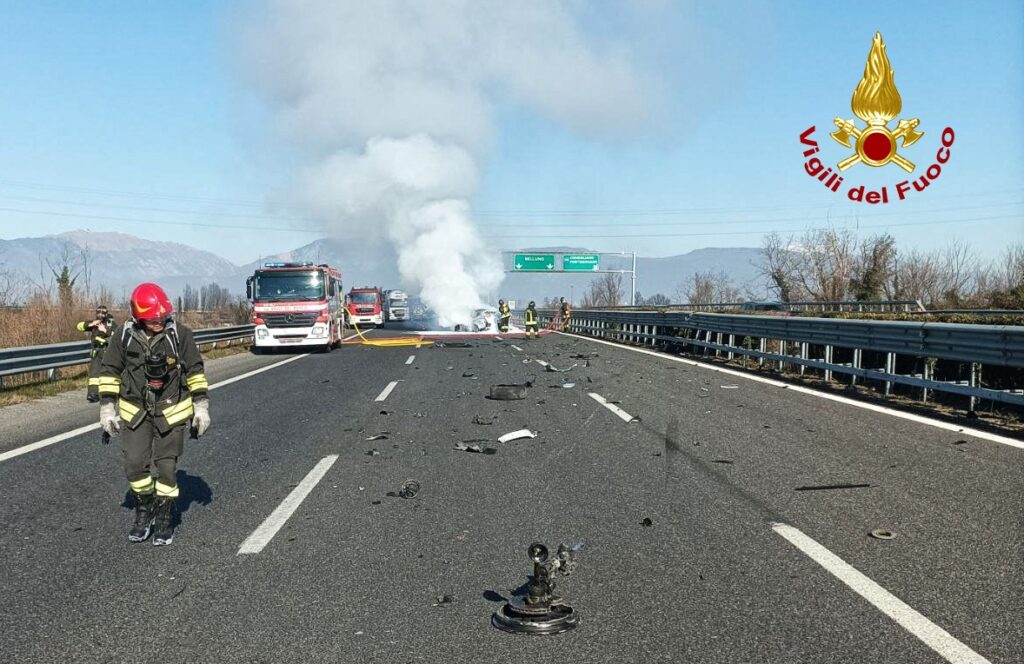 Incidente shock in A27, Mercedes GLC contromano prende fuoco dopo lo scontro: due feriti
