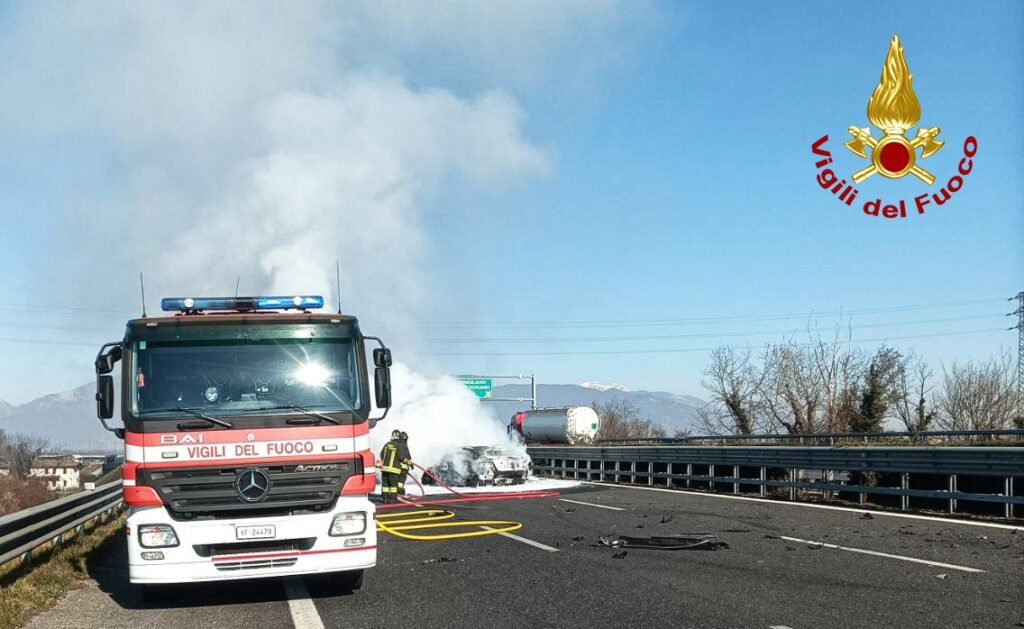 I pompieri arrivati da Conegliano e Vittorio Veneto, hanno spento le fiamme della Mercedes GLC Coupé che viaggiando in senso contrario si è scontrata sul lato destro della vettura con il lato destro di una Fiat Tipo.