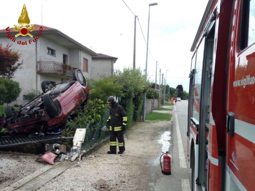 Fiume Veneto: sbanda, invade la corsia opposta, sfonda il cancello e si rovescia nel cortile
