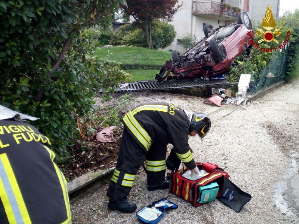 La conducente della Fiat Multipla perdeva il controllo dell'auto e finiva, dopo aver invaso l'opposta corsia di marcia, nel cortile di un'abitazione distruggendo la recinzione e il cancello, per poi rovesciarsi.
