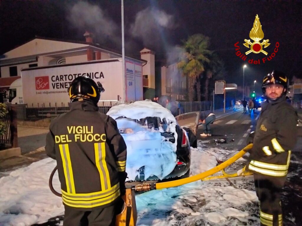 I pompieri arrivati da Vicenza, hanno spento con la schiuma l’auto, mentre il motociclista è stato preso in cura dal personale del Suem e trasferito in ospedale.