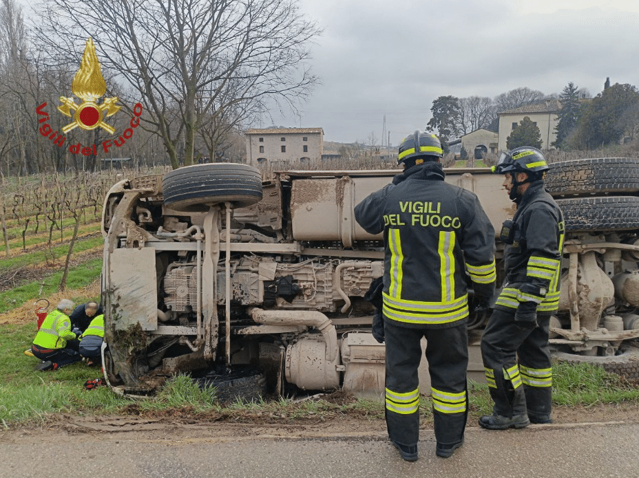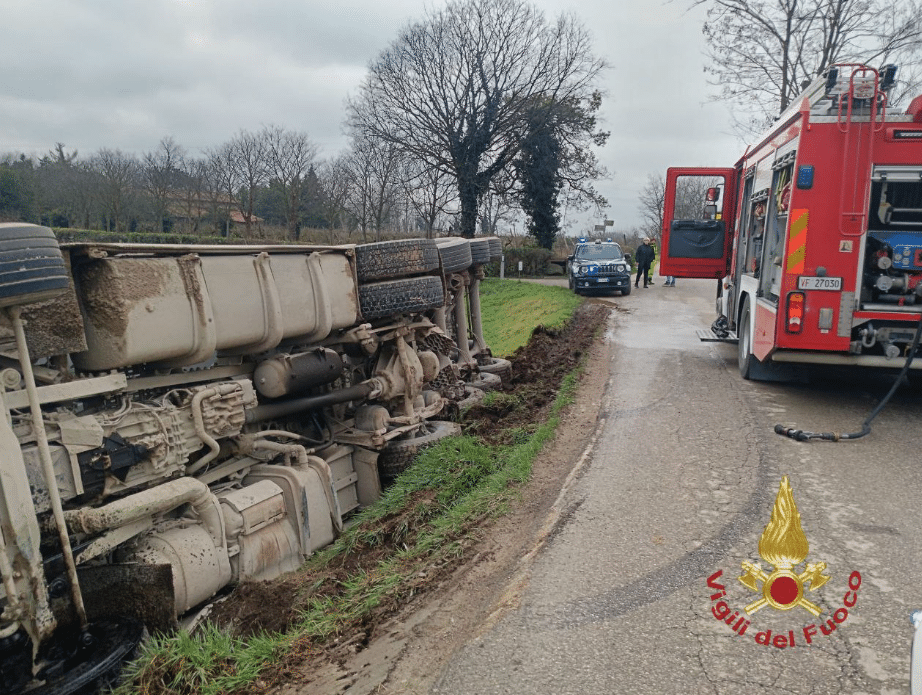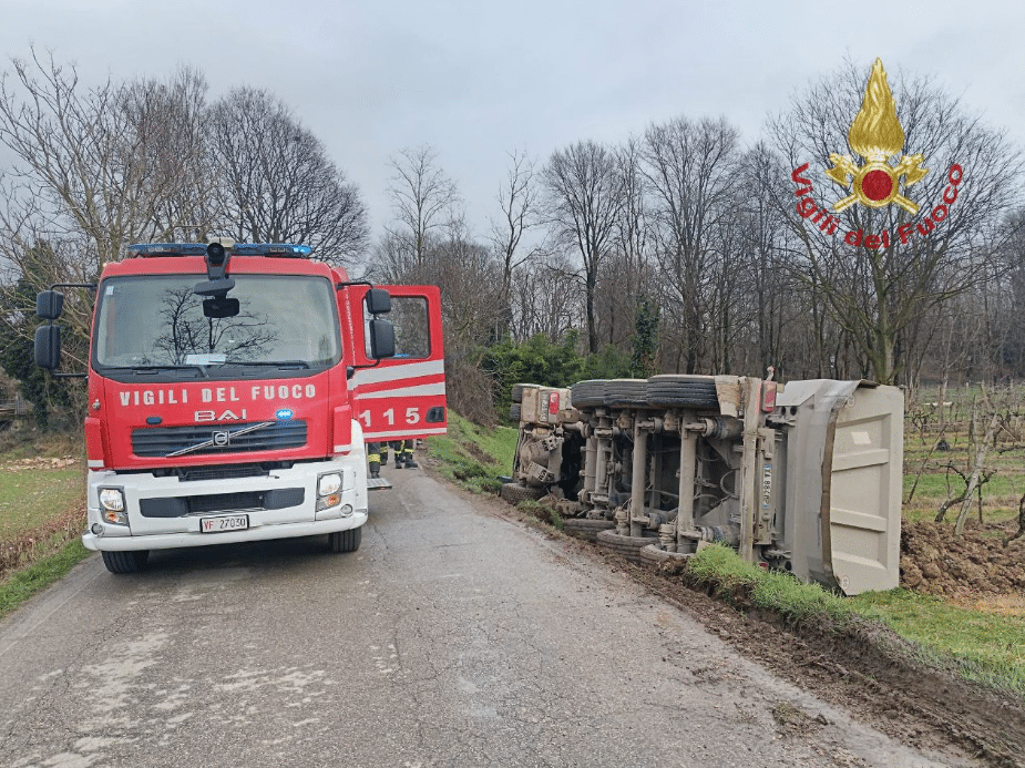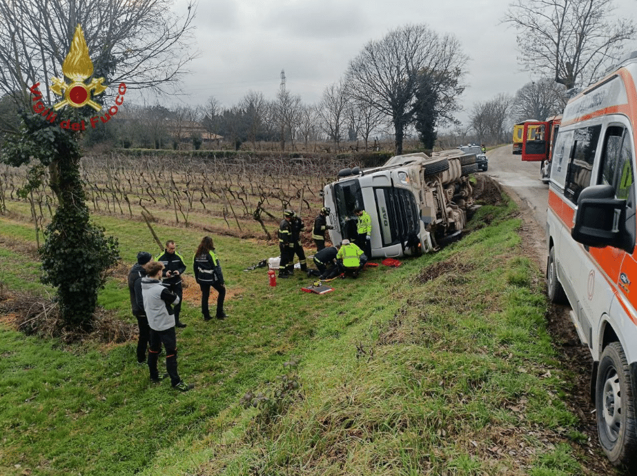 Incidente a Castelnuovo del Garda: un camion si rovescia, ferito il conducente. Intervento dei vigili del fuoco e trasporto in elisoccorso all'ospedale.