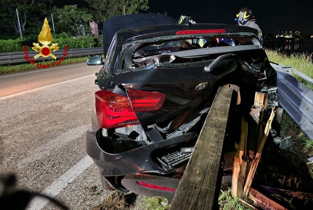 CHIOGGIA. Alle 23:10, di mercoledì, i vigili del fuoco sono intervenuti in Via Brondolo a Chioggia per un’auto finita contro il guardrail la cui barriera di copertura di legno è penetrata longitudinalmente nell’abitacolo: due feriti.