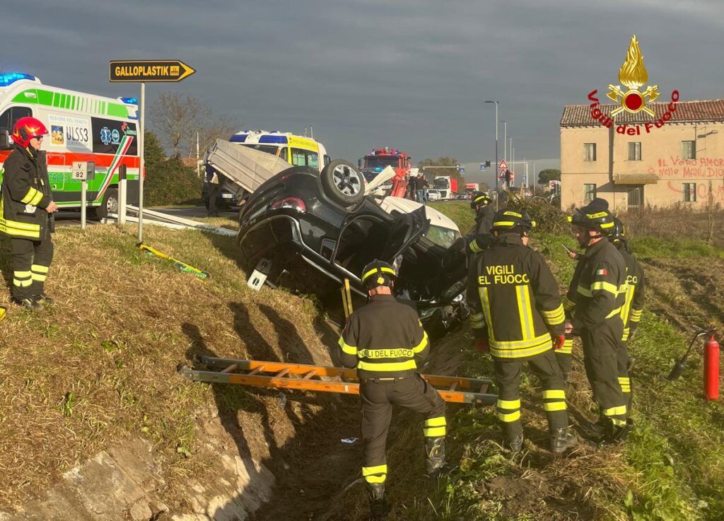 CHIOGGIA. Alle 8:15, di lunedì 25 novembre, i vigili del fuoco sono intervenuti lungo la SS 309 Romea incrocio Ca’ Lino a Chioggia, per un incidente tra un furgone cassonato e un SUV finito rovesciato nel fossato a bordo strada: tre feriti, di cui una donna in codice rosso.