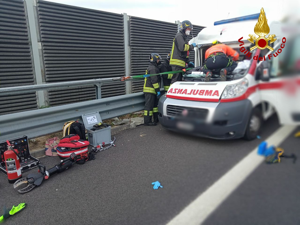 Giunti sul posto i Vigili del fuoco hanno trovato un ambulanza che aveva tamponato un mezzo pesante. All'interno del mezzo sanitario una persona era rimasta incastrata tra le lamiere del mezzo quindi i Vigili del fuoco, in collaborazione con il personale sanitario, hanno estricato la ferita tagliando le lamiere del veicolo con le cesoie idrauliche.