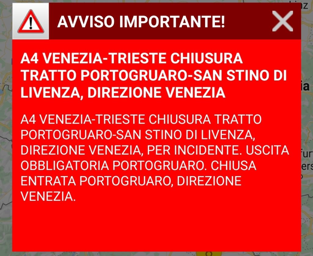 Traffico reindirizzato sulla A28 e A4 chiusa per chi è diretto a Venezia a causa di un incidente avvenuto nell’autostrada A4 nel tratto tra il Nodo di Portogruaro e San Stino di Livenza.