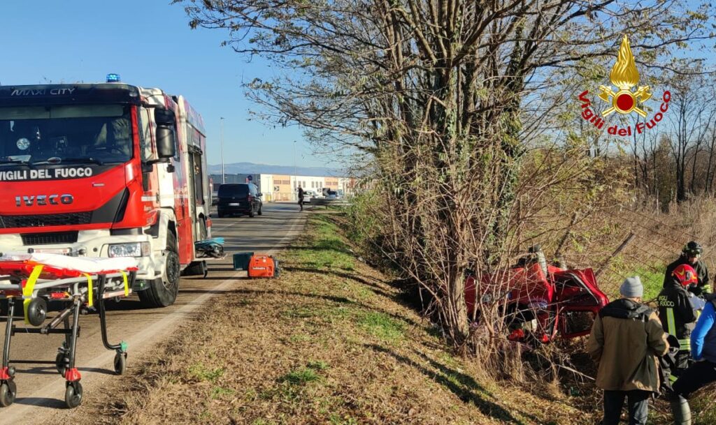 I pompieri accorsi da Vicenza, hanno messo in sicurezza la Toyota Aygo capovolta ed estratto la conducente rimasta incastrata.