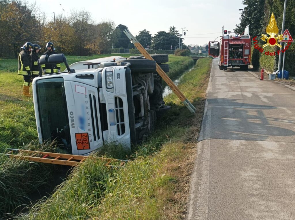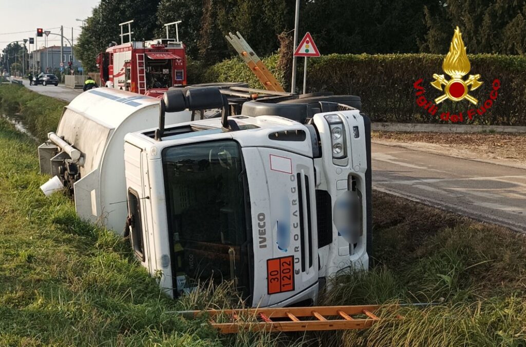 MIRA (VE). Incidente stradale oggi martedì 28 novembre 2023, poco prima delle 13:00, in Via Seriola Veneta Sinistra a Mira (VE). Per cause in corso di accertamento da parte delle forze dell'ordine un’autocisterna di gasolio è finita rovesciata su un fianco nel fossato a bordo strada: illeso l’autista.