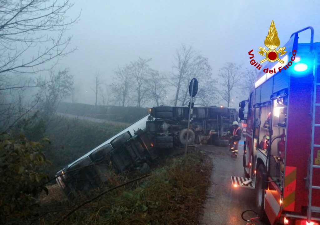 MONSELICE (PADOVA). Alle 7:10, di giovedì, i vigili del fuoco sono intervenuti via Eroi Divisione Acqui a Monselice per un autoarticolato finito rovesciato fuoristrada: ferito il conducente.