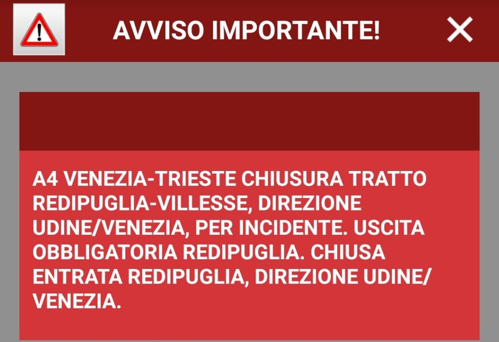 Un grave incidente è avvenuto nel tratto autostradale della A4 tra Redipuglia e Villesse in direzione Venezia. Alle 9,00 circa si è verificato un tamponamento fra tre mezzi pesanti. Sul posto ci sono la polizia stradale per i rilievi, i vigili del fuoco, il personale di Autovie Venete, i mezzi soccorso meccanico. Una persona risultava incastrata nell’abitacolo del proprio mezzo, estratto purtroppo senza vita. La Concessionaria ha attivato la chiusura del tratto tra Redipuglia e il bivio A4/A34 e del casello di Redipuglia in entrata in direzione Venezia.