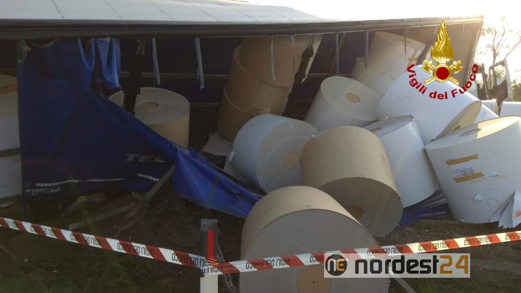 Illeso l’autista del mezzo pesante. Sono ora in corso le operazioni di recupero dei mezzi e del carico del camion: grandi bobine di carta perse durante il sinistro.