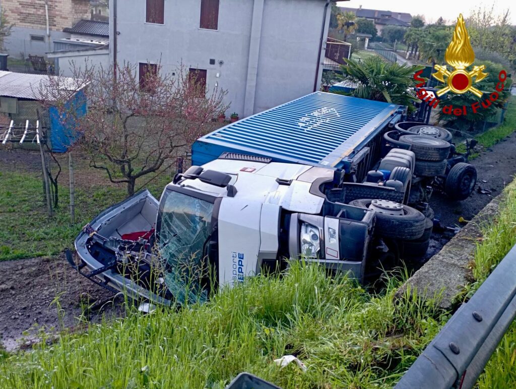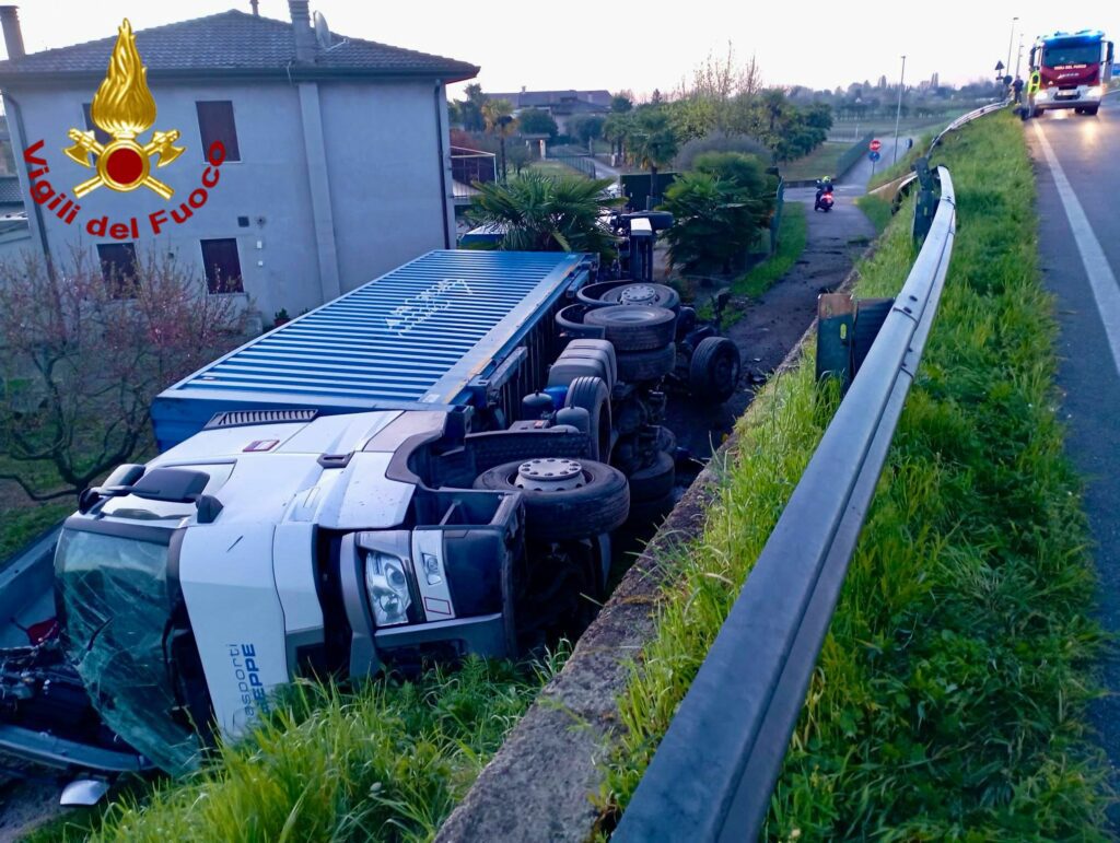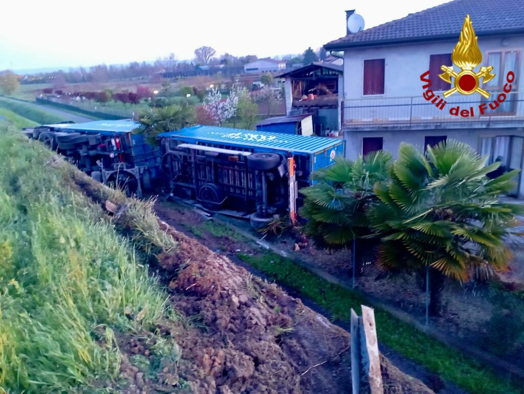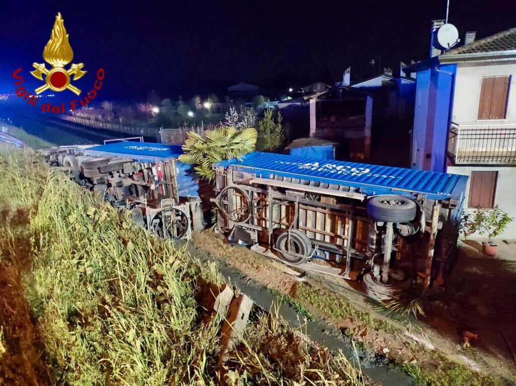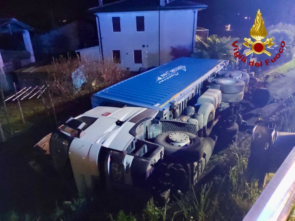 Illeso l’autista. I pompieri accorsi da Piove di Sacco e Padova, hanno messo in sicurezza il mezzo e predisposto le operazioni per il successivo recupero da parte del soccorso stradale del mezzo pesante e del rimorchio.