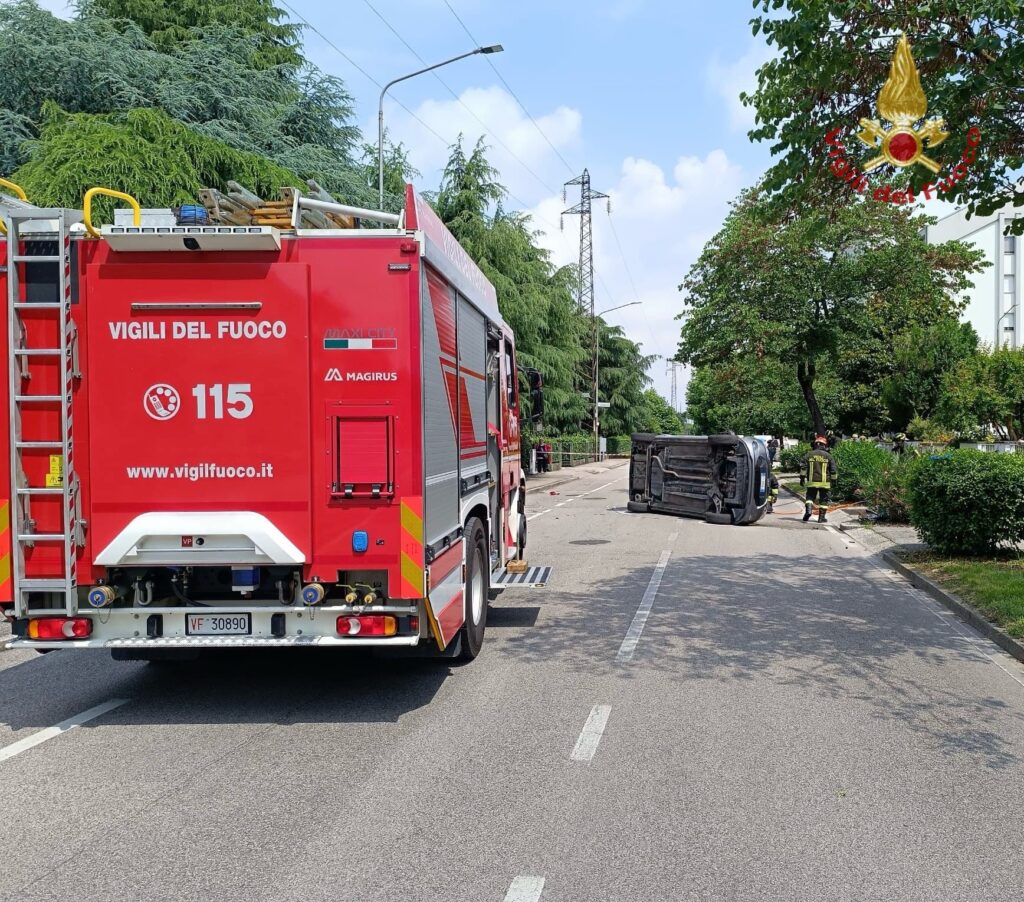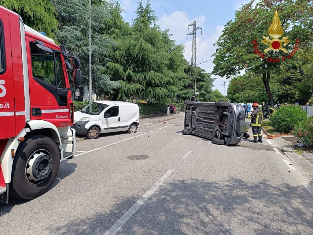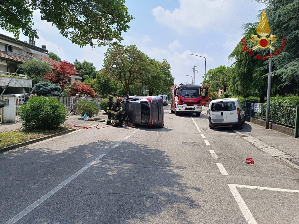 Dopo lo scontro, l'auto si ribalta: la conducente rimane incastrata nel mezzo, salvata dai pompieri