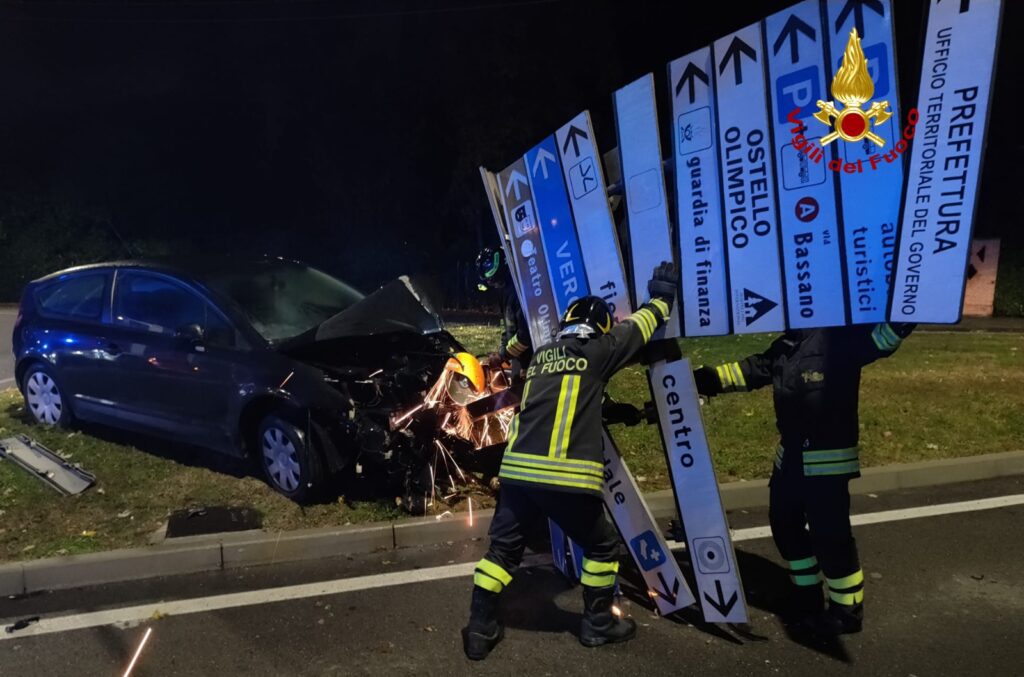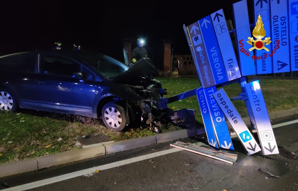 VICENZA. La notte scorsa, alle 2:35 di domenica, i vigili del fuoco sono intervenuti in viale Margherita incrocio con via Arzignano a Vicenza per un'auto finita contro la segnaletica stradale, mentre percorreva la via in senso contrario.