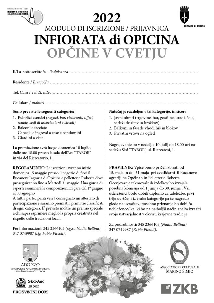 Ha preso il via la tredicesima edizione dell'“Infiorata di Opicina 2022”, manifestazione promossa dal Consorzio Insieme a Opicina - Skupaj na Opčinah in collaborazione con l'Associazione per la Difesa di Opicina-Združenje za Zaščito Opčin e le cui iscrizioni, gratuite, sono aperte ancora fino al 31 maggio.