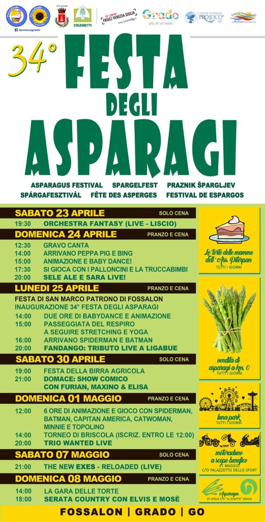 Riprende dopo due anni di stop forzato una delle manifestazioni più tipiche e attese della gastronomia regionale, la Festa degli Asparagi di Fossalon, dove l’asparago bianco è protagonista assoluto di gustosi piatti e del ricco programma di iniziative a corollario.