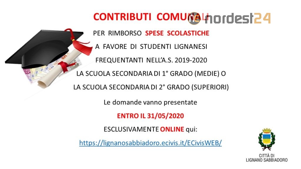 Informo che è stato pubblicato il Bando per la concessione dei contributi comunali a favore dei studenti lignanesi per il rimborso delle spese sostenute durante l'anno scolastico 2019-2020 presso la Scuola Secondaria di 1° o di 2° grado.