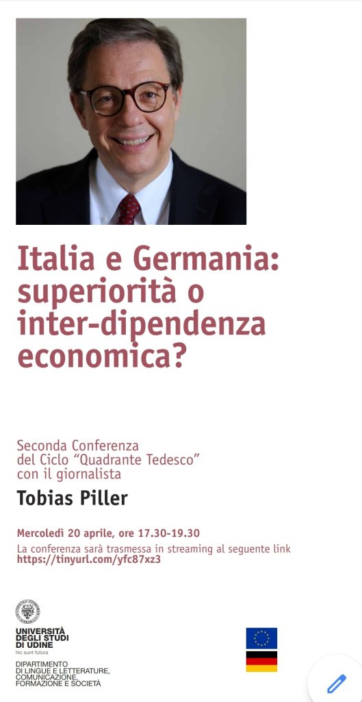 Udine, 18 aprile 2022 – “Italia e Germania: superiorità o inter-dipendenza economica?”. È il titolo della conferenza che Tobias Piller, responsabile della redazione economica della Frankfurter Allgemeine Zeitung, uno dei più importanti quotidiani tedeschi, terrà online all’Università di Udine mercoledì 20 aprile, dalle 17.30. La conferenza sarà trasmessa in streaming al link https://tinyurl.com/yfc87xz3.