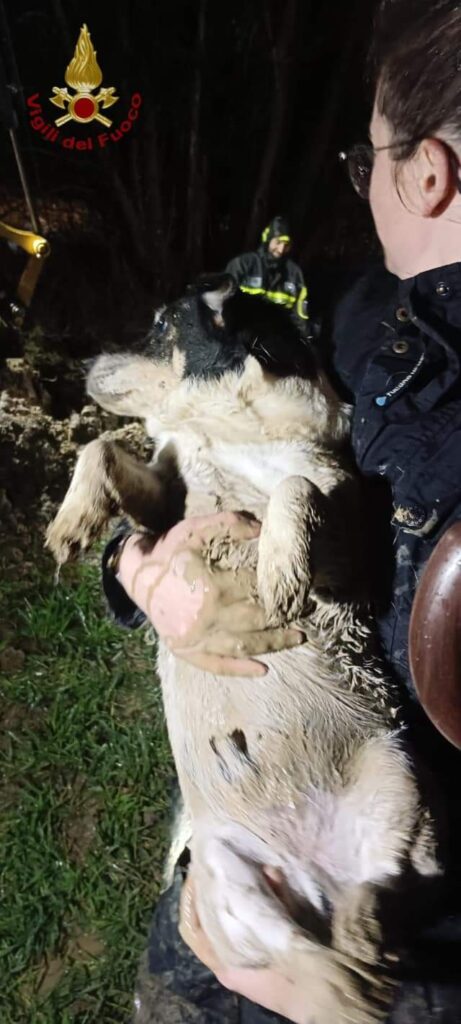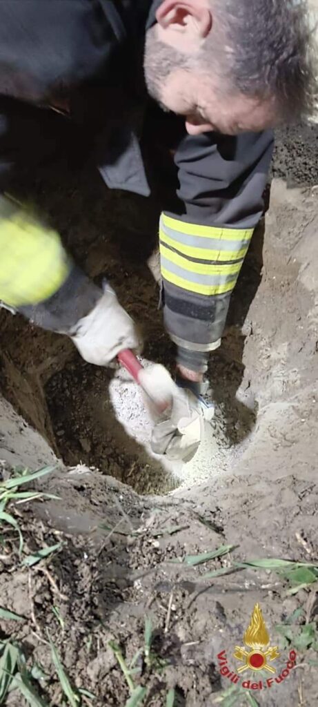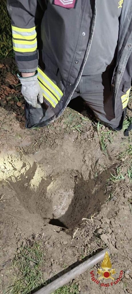 A liberare il cane impaurito ci hanno pensato i vigili del fuoco di Venezia intervenuti ieri pomeriggio in via Comugne, a Pramaggiore, scavando una cavità a mano e con l’ausilio di un escavatore per liberare la terra cumulata nell’area.