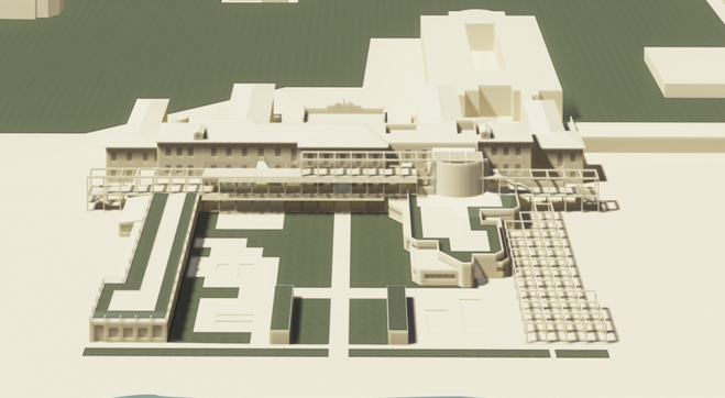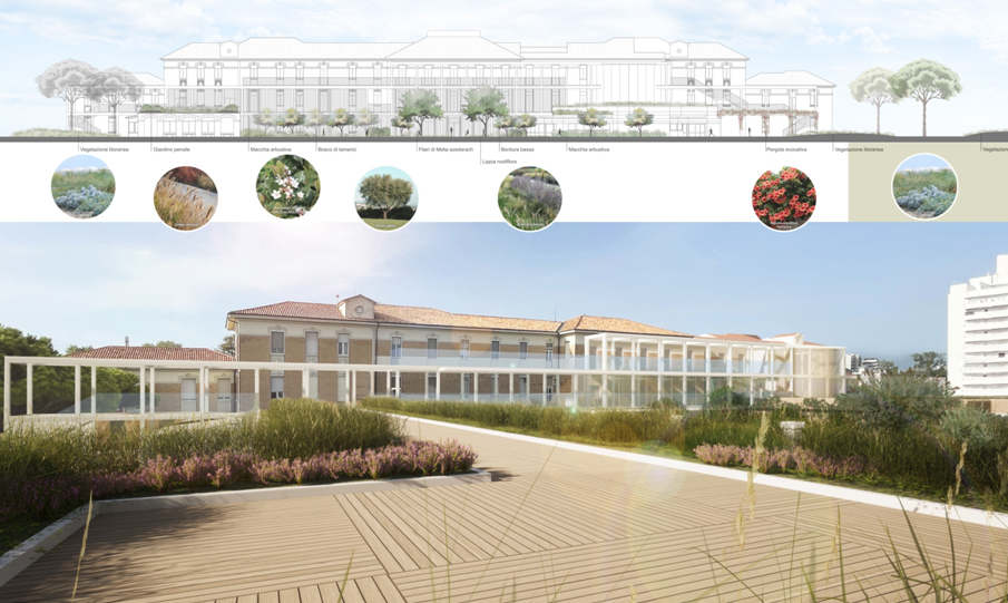 Per quanto riguarda gli interventi estetici, elementi architettonici ricreeranno le terrazze elioterapiche originarie; il braccio ad est dell’ospedale verrà ricostruito in continuazione la radiologia mediante nuovi materiali, allo scopo di riproporre visivamente i due rami laterali del monoblocco che alle origini si estendevano verso il mare; tra i due rami dell’ospedale nascerà inoltre un parco terapeutico con percorsi nel verde costituito da alberi, tamerici ad altra vegetazione. L’ingresso dell’ospedale verrà mantenuto pressoché uguale allo stato attuale ma con vista direttamente sul mare ed avrà un sistema di superamento delle barriere architettoniche mediante rampe già dall’esterno. Il tutto è stato condiviso con la Soprintendenza in quanto l’area e l’ospedale stesso sono tutelati da vincoli storici e paesaggistici.