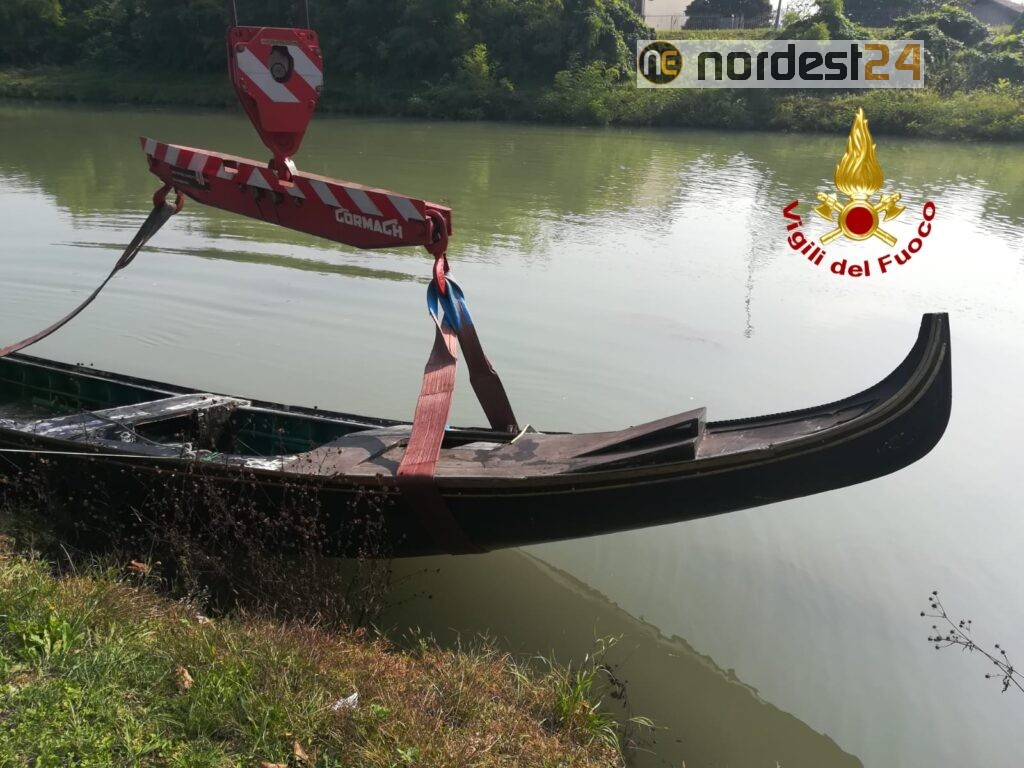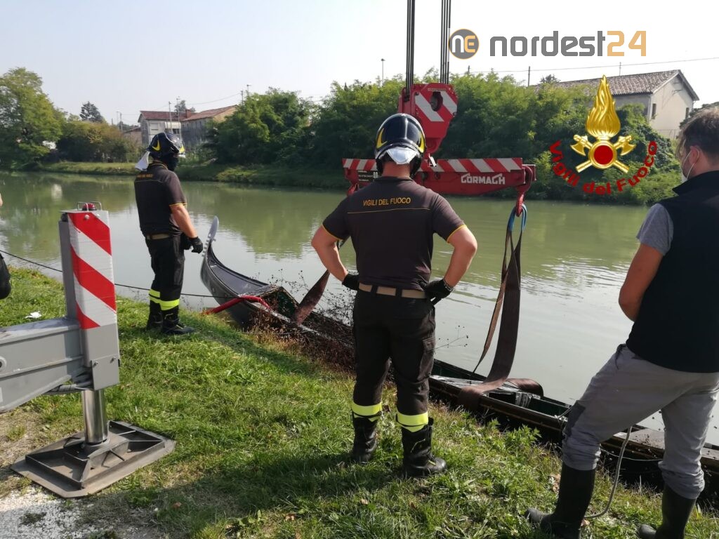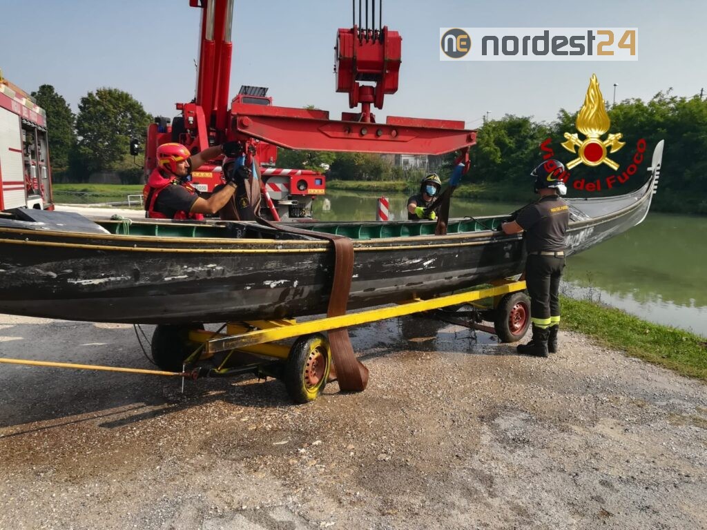 I pompieri arrivati dal distaccamento di Mira e Mestre con l'autogru, hanno prima aspirato l'acqua con una pompa per poi tirare in secco la gondola.