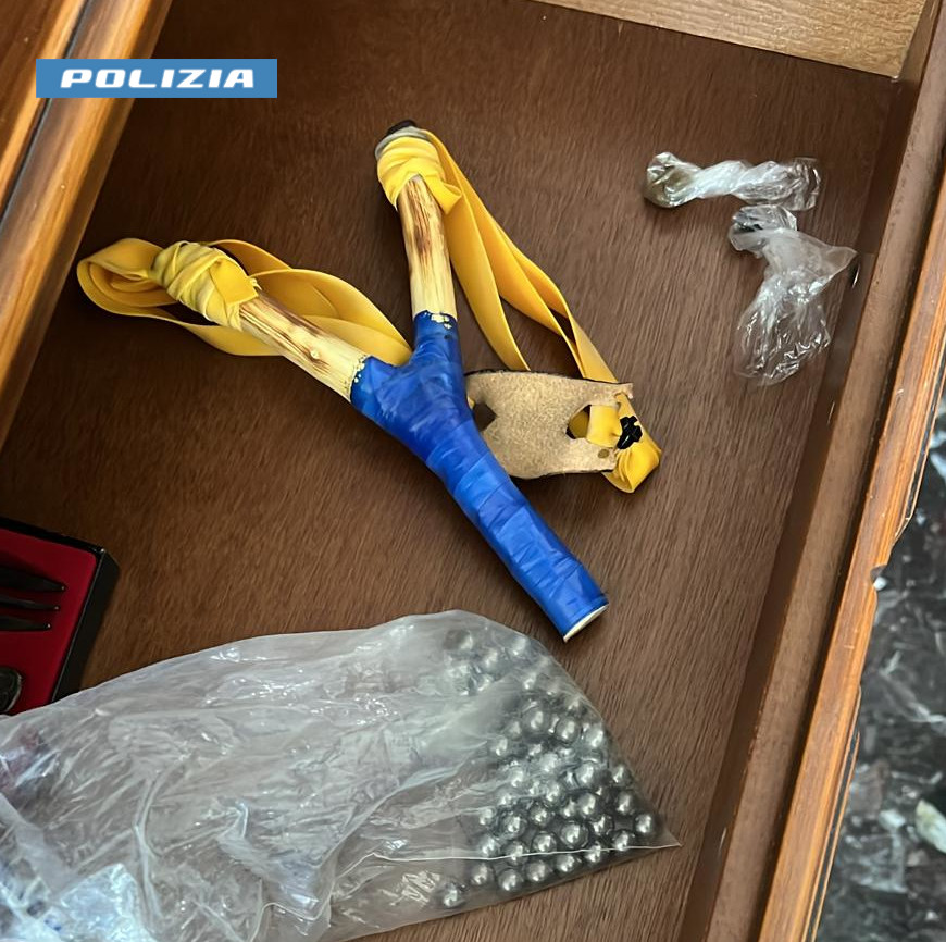 All’interno di un cassetto di un mobile nella sua disponibilità, gli agenti hanno rinvenuto e sequestrato la fionda utilizzata ed altri 62 pallini dello stesso tipo e diametro di quelli lanciati due giorni prima.