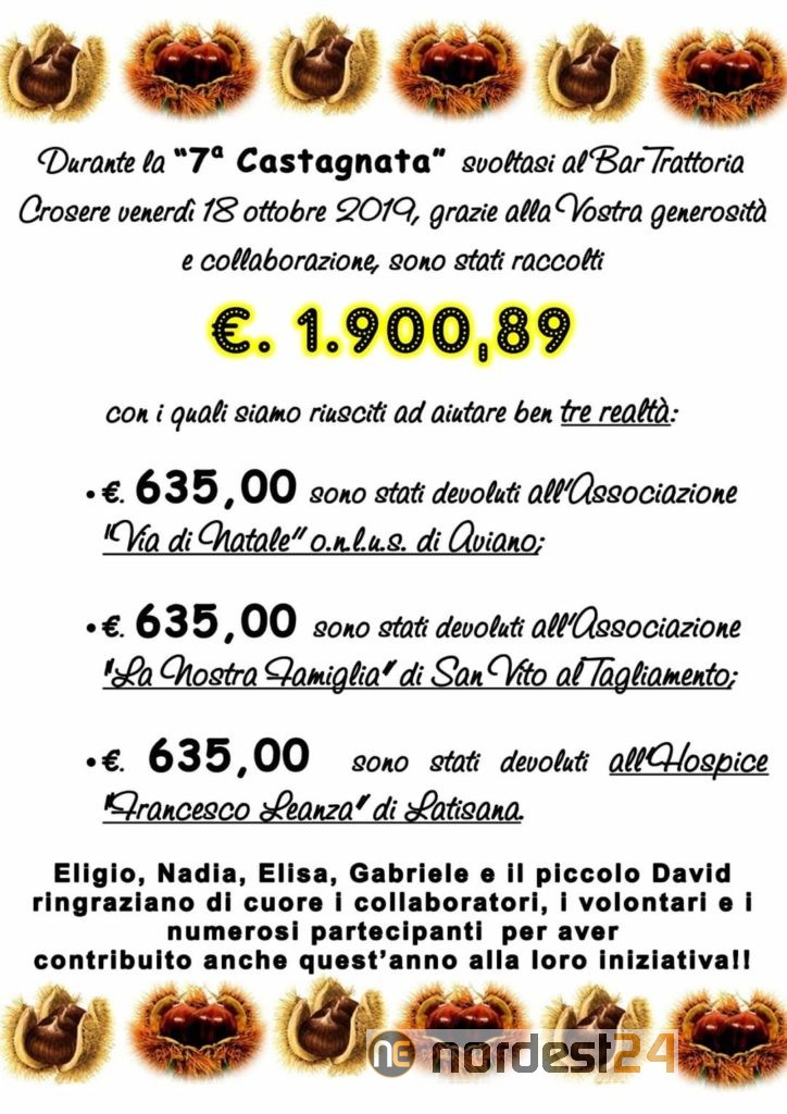 LATISANA. Una castagnata solidale con una cifra importante raccolta nella bassa friulana.È successo a Latisana in provincia di Udine al bar trattoria Crosere di Roncaglia Eligio.Gli stessi titolari ha...
