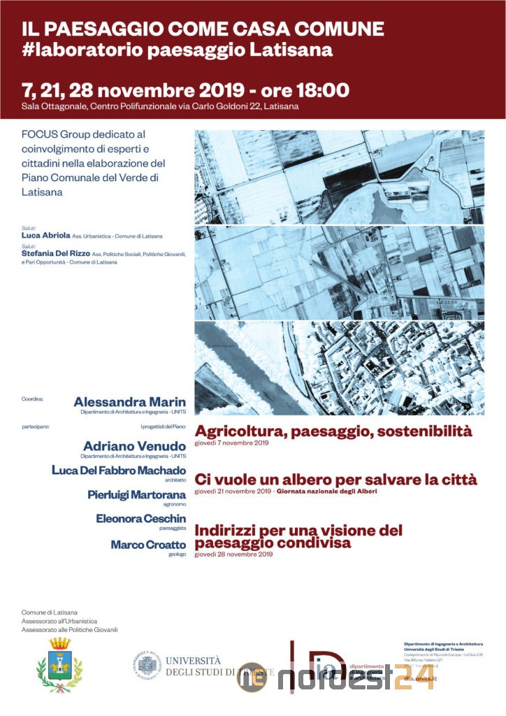 Infine, giovedì 28 novembre, sempre alle 18, nell’incontro “Indirizzi per una visione del paesaggio condivisa” si tireranno le somme degli appuntamenti precedenti, intavolando una discussione costruttiva utile alla concreta programmazione, autenticamente partecipata, del Piano Comunale del Verde per il Comune di Latisana, di cui si specificheranno le caratteristiche progettuali.
